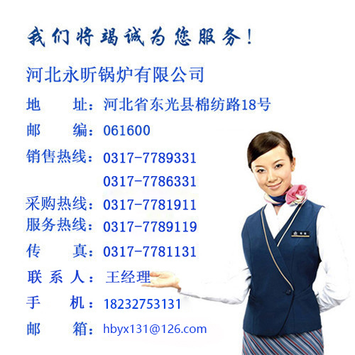 公司名稱:河北永昕鍋爐有限公司 公司地址:河北省東光縣棉紡路18號 電話:0317-7789331、7786331 傳真:0317-7781131 網(wǎng)址: