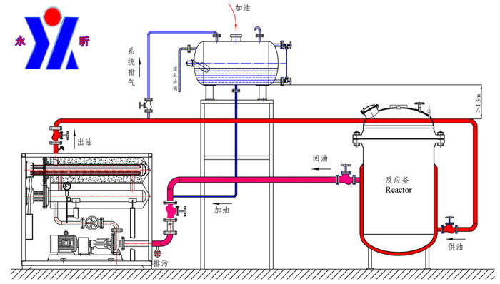 通常導(dǎo)熱油加熱機(jī)組由主機(jī)(加熱體、高溫油泵及過(guò)濾器)、高位槽、低位槽、控制柜、管路等作為一整套設(shè)備與用熱設(shè)備共同組裝形成強(qiáng)制性液相循環(huán)的加熱系統(tǒng)。